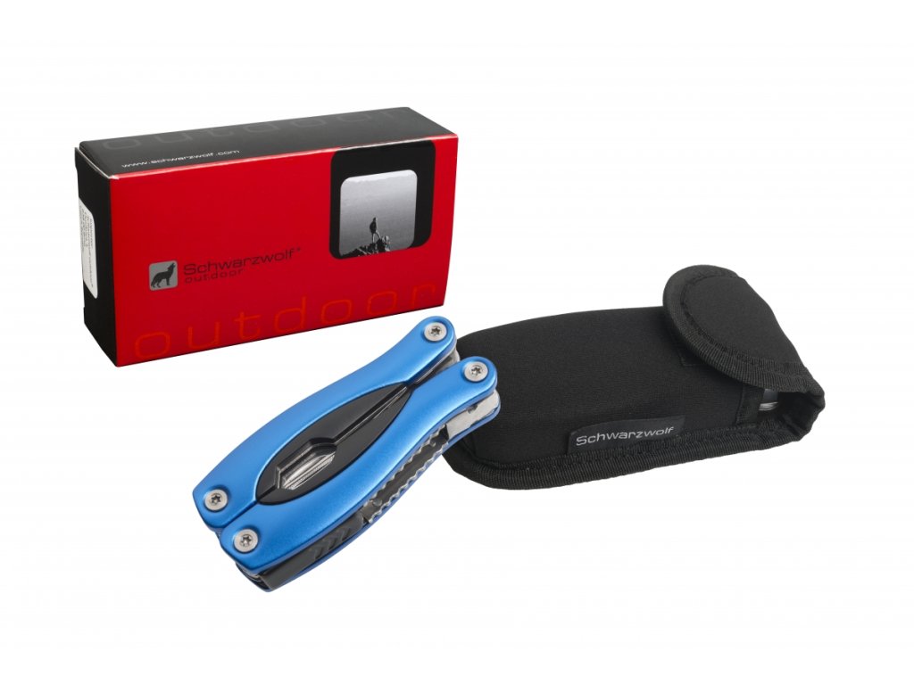 Značkové kombinované náradie Schwarzwolf, pätnásť nástrojov, ktoré obsahujú poistku, v čiernom neoprénovom puzdre.
